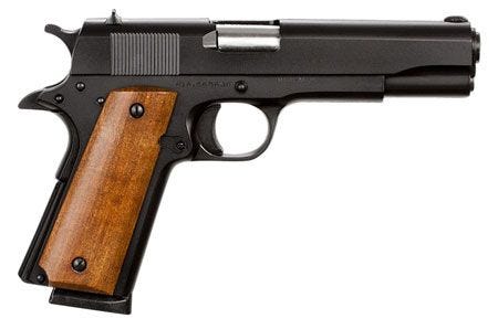 The M 1911 GI Standard FS has fixed, low profile sights and traditional smooth slim design that is ideal for quick pull holster use. The barrel and slide have a black Duracoat finish and the smooth wood grips offer comfort in both feel and design. The 5″ barrel offers a balanced weight to assist with the accuracy and recoil.