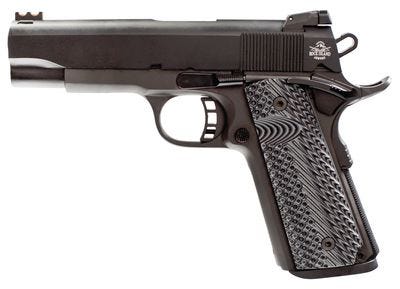 Armscor Rock Ultra FS Black The Rock Ultra MS pistol is built in traditional 70 series design and delivered with our precise engineering standards and first rate upgrades. This pistol is chambered in 45 ACP with a 4.25” button rifled barrel supported by a full length guide rod. Smooth angled, snag-free style allows for quick draw in fast need situations. Includes a low profile adjustable rear sight and high visibility fiber optic front sight. Also includes skeletonized hammer and trigger with adjustable over travel stop and ambidextrous safety, which comes standard in the Rock series. The Rock Ultra is finished with a tough parkerzied matte coating and adds battle ready G10 tactical grips. True to all Rock Island 1911s, the Rock Ultra comes with a crisp factory 4- to 6-pound trigger to give you a great experience right out of the box. Armscor Rock Ultra FS Black Specifications: Caliber: 45ACP Capacity: 8 Rounds SIGHTS Front: Dovetail Fiber-Optic Front Sight Rear: LPA MPS1-Type Adjustable Rear Sight WEIGHT Unloaded: 2.36 lbs / 1.07 kg Loaded: 2.73 lbs / 1.24 kg DIMENSIONS Length: 8 inch / 203 mm Width: 1.406 inch / 36 mm Height: 5.5 inch / 140 mm GRIPS & FINISH Grips: G10 Frame Parkerized BARREL Length: 4.25 inch / 108 mm Grooves: 6 Grooves OTHER FEATURES Trigger Pull: 4 – 6 lbs / 1.81 – 2.72 kg Length of Twist: 1 in 16 inch / 400 mm