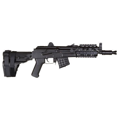 Arsenal’s SAM7K-03 is a semi-automatic pistol in 7.62x39mm caliber with Arsenal’s Picatinny quad rail handguard system (PR-03) and featuring Sig Sauer’s SB15 Pistol Stabilizing Brace on the receiver extension to improve single handed shooting. It has a 10.5″ chrome-lined, hammer-forged barrel, a front sight block/gas block combination, forged and milled receiver, a hot-die hammer-forged bolt, bolt carrier group, and trigger group. It has a reinforced black polymer pistol grip stock, ambidextrous safety lever, AK scope rail, and a rear peep sight with two settings. The receiver extension has a waterproof storage compartment with a sealing, threaded cap. It ships with one 5-round mil-spec Bulgarian Arsenal magazine, sling, cleaning rod, oil bottle, and cleaning kit.