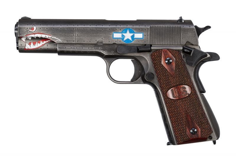 Auto-Ordnance Squadron Special Edition WW2 1911 45ACP 5″ 7RDs Features: With GI specs and features, experienced shooters will find the fit and function comfortable and familiar. New shooters will find the controls exceptional and intuitive. The carbon steel slide, sear and disconnector are precision machined from solid bar stock and proper heat treated to give you thousands of rounds of long life and durability. Arguably, the most famous and widely recognized and respected handgun in the world, the 1911 is combat proven. This example from Auto-Ordnance will be well suited to any task you ask of it, from professional duty weapon to competition or personal defense and concealed carry. Along with the famous shark mouth artwork found on WW2 fighter plane squadrons this 1911 features a black and gray Cerakote finish. Auto-Ordnance Squadron Special Edition WW2 1911 45ACP 5″ 7RDs Specifications: Auto-Ordnance 1911BKOWC3 1911 Single Action Pistol .45 ACP 5″ Barrel 7 Rounds Full Size .45 ACP Magazine Blade Front Sight Rear Drift Adjustable For Windage Single Sided Thumb Safety Checkered Wood Grips with US Logo Custom Engraved to Resemble a WW2 Fighter Plane Featuring Famous Shark Mouth Artwork All Steel Construction GI Specs and Features Overall length 8.5″ Overall Weight 39 oz. Rivets and Panels Two Color Black and Gray Cerakote Finish
