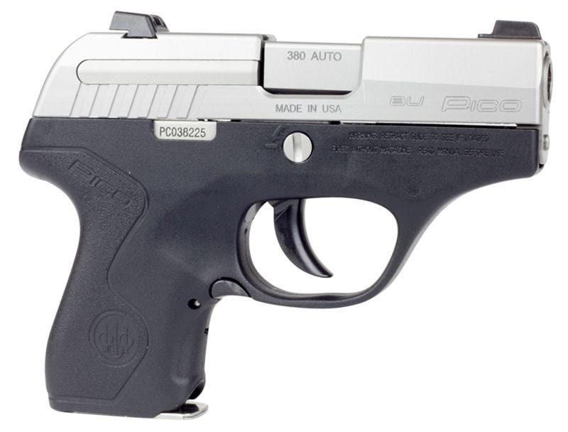 Beretta Pico .380 ACP Features: The Beretta Pico built from the ground up as a compact carry pistol and is one of the thinnest .380 semiauto handgun on the market, measuring only 18mm at its widest point. Weighing only 11.5 oz. unloaded, this DAO pistol is comfortable and unobtrusive to carry, no matter your preferred mode. The Pico’s flat profile and snag-free lines make it perfect in a pocket holster, while its smooth sides and controls also make it ideal for inside-the-waistband carry, coupled with its extra-durable stainless steel/polymer construction that is highly sweat-resistant. The Pico is soft-recoiling and makes target recovery lightning-quick after every shot, thanks to its minimal barrel tilt. It has an ambidextrous magazine release, as well as a super-low-profile slide-release lever to keep the slide open when desired. The Pico ships with a soft storage case and two 6-round stainless steel magazines (one flush, one with grip extension). This model has a black polymer grip frame and a matte stainless steel slide. Beretta Pico Two-Tone Specifications: Brand: Beretta USA Category: Semi Auto Handguns Caliber: 380 Automatic Colt Pistol (ACP) Model: Pico Series: 380 Type: Pistol Frame Finish: Black Action: Double Action Only Slide Description: Stainless Steel Capacity: 6 Case Type: Soft Frame Material: Polymer Grips: Black Polymer Grip/Frame Safety: No Manual Safety Sight Configuration: 3-Dot Drift Adjustable Sight Style: Contrast Weight: 11.5 oz Barrel Length: 2.7″
