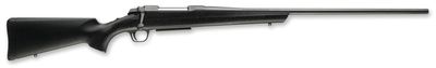 Browning’s AB3 Composite Stalker gives you legendary A-Bolt accuracy and performance in a value-packed platform. The AB3 Stalker combines a matte blued finish barreled action with a rugged matte black synthetic stock to create a high-performance hunting rifle that won’t blow a hole your budget. Button-Rifled barrel is triple-checked for straightness and interior finish and then air-gauged to ensure a consistent diameter throughout the bore’s length. Every AB3 barrel is individually finished with a hand-reamed chamber for tighter tolerances and more precise headspace. The barrel’s target-type Crown enables the uniform release of gas as the bullet exits the muzzle, helping prevent any unwanted shift in trajectory. The Crown is recessed to protect it from accidental impact damage that can degrade accuracy. The free-floating barrel eliminates contact interference from the fore-end, enabling the barrel to perform consistently and accurately and reach its full accuracy potential. The receiver is drilled and tapped for scope mounts using two 8-40 screws for each base to provide a rock-solid optics mounting platform. The AB3’s unique integrated trigger design provides a crisp 3-pound pull that “breaks like glass.” The generous trigger guard opening allows easy access, even when wearing gloves. A robust, precision-machined standard-length steel action allows you to mount your scope extremely close to the center of the bore to minimize the offset between the bore centerline and the optical centerline. The fast 60 bolt lift keeps your thumb and fingers clear of the scope when cycling the action and allows the bolt to be operated in a smoother/quicker motion. The bolt body is plated with matte electroless nickel for smother operation and added corrosion resistance. The Bolt Unlock Button allows you to unload the chamber with the safety in the on-safe position for an added margin of safety. The top-tang safety offers easy accessibility without removing your firing hand from the stock. You can quickly manipulate the safety, or verify the position of the safety, without losing your sight picture or cheek weld. The detachable staggered box magazine has a rugged formed steel body and feed lips for added durability, plus a tough polymer baseplate and shoulder that’s designed to stop the forward movement of the cartridges. This helps prevent recoil-induced bullet tip deformation and bullet setback in the cartridge case. Magazine capacity is 3 rounds in magnum calibers, and 4 rounds in standard calibers. The innovative Inflex Technology recoil pad uses directional deflection to pull the stock down and away from your face when firing to reduce felt recoil and flinching. A durable matte blued steel finish on all external surfaces minimizes reflection and provides resistance to corrosion. The rugged synthetic stock with molded-in matte black color and textured gripping surfaces can stand up to virtually anything you (or Mother Nature) can dish out. Steel sling swivel studs are pre-installed for easy mounting of your sling or bipod.