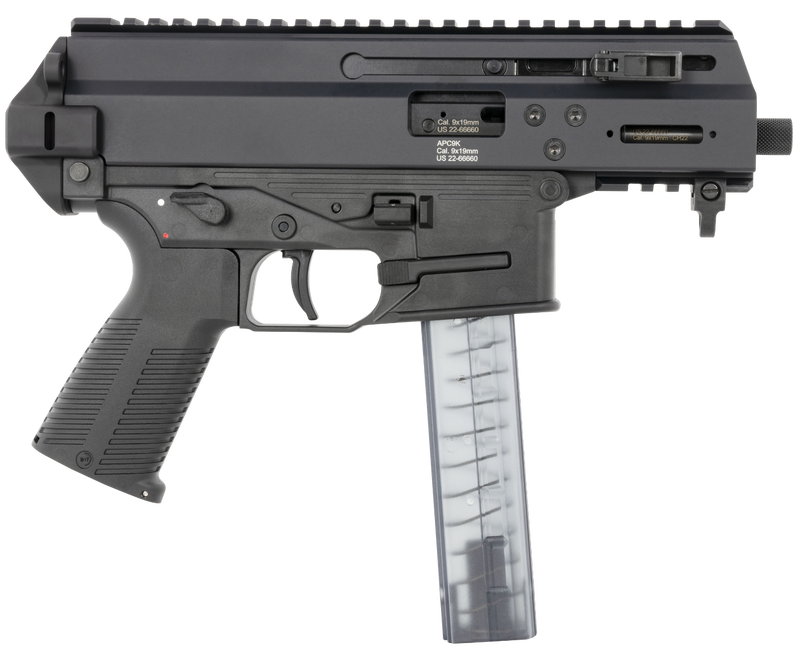 As one of the flagships of B&T, the APC PRO line represents a breakthrough in customization and modularity on a pistol-caliber platform. Every component is of the highest quality, and is meticulously machined and fitted with the Swiss-made precision that B&T is known for. The APC PRO itself is equipped with several major upgrades such as enhanced lower receiver ergonomics and a side positioned bolt hold open/release. The APC PRO also sports a non-reciprocating, auto-folding charging handle to reduce the risk of snagging on loose clothing/equipment.