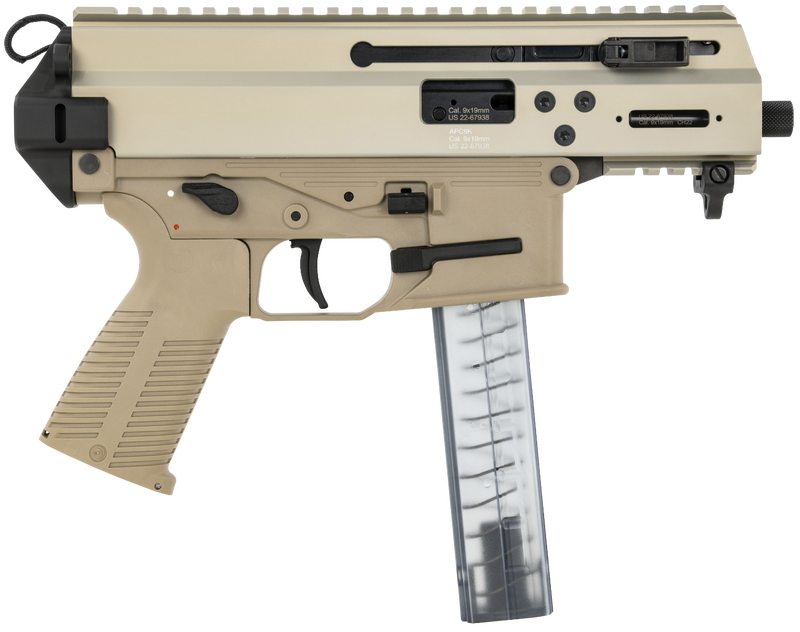 The B&T APC9K PRO features functional updates that include dual auto-folding, non-reciprocating charging handles, improved lower receiver ergonomics, a replaceable pistol grip, and M-LOK accessory slots. Glock and SIG SAUER compatible lower receiver groups are also available. The APC9K ships as a pistol. Multiple stock and brace options are available for purchase separately.
