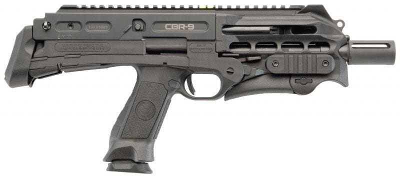 Chiappa CBR-9 Black Rhino Pistol Features Chiappa’s CBR-9 pistol features a semi-auto blowback system and automatic extractors. It also has a reversible cocking lever with ambidextrous mag release, safety, bolt release, and rear sling swivel. The tactical pistol utilizes a steel receiver and polymer frame. It comes with a mag loader and two 18-round magazines. Chiappa CBR-9 Black Rhino Pistol Specifications Caliber: 9mm Action: Semi-Auto Barrel Length: 9″ (225mm) Capacity: 18 1 Feed In: Magazine Trigger System: Single Grips: Synthetic Pistol Grip Stock: Polymer Front Sight: Fixed Fiber Optic Flip Up Rear Sight: Fixed Fiber Optic Flip Up Safety: Automatic, Trigger and Manual Weight: 4.8 lbs Length: 16.9″ Material: Steel / Polymer Finish: Blued / Matte Black Extraction: Auto Ejection Notes: Includes 2 Magazines & Loader