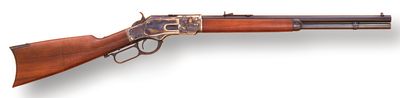 CIMARRON FIREARMS CO. MODEL 1873 SHORT RIFLE•“Rifle that Won the West” •Lever action •Case hardened frame •Walnut stock & forearm •Blued finish •Wt.: apx. 8 lbs. Cal.: .45 Colt – Brl.: 20″ – Cap.: 10
