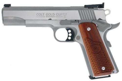 Colt Gold Cup Trophy 45ACP Custom Competition 5-inches SS 8Rds Features: The Colt Gold Cup Trophy has been reborn as the ultimate choice for the modern competitor participating in any handgun challenge. True to it’s legacy, the newly redesigned Gold Cup® features what seasoned shooters want. competition ergonomics, a beveled magazine well for easy reloading, adjustable rear sight, and those stunning Colt competition grips. For the weekend warrior rising through the ranks or the full-time competitive shooter, there really is no other option – the new Colt Gold Cup Trophy. Colt Gold Cup Trophy 45ACP Custom Competition 5-inches SS 8Rds Specifications: Caliber: .45 ACP Barrel: 5″ Stainless steel frame & slide G10 Grip Bomar style adjustable rear sights Partridge style front sights Gold Cup wide trigger Upswept beavertail Custom shop box Two 8-round magazines Weight: 38 oz