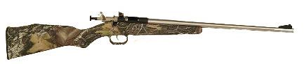 Crickett’s Single Shot 22 LR rifle features a Mossy Oak Break Up synthetic stock, iron rear sight, and a bolt action constructed from alloy nickel plated steel.