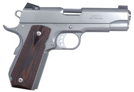 It’s the solution for those who prefer a smaller model 1911, but insist on complete reliability. The slide has been reduced to the minimum possible without significantly impairing the legendary reliability of the 5″ slide. The frame has been modified with the innovative Ed Brown Bobtail housing which reduces the projecting butt of the mainspring housing without sacrificing the full size frame and magazine capacity. The Bobtail minimizes the print under your jacket when carrying and reduces weight. Slides shorter than 4.25″ are notorious for reduced reliability. These problems are eliminated with the Ed Brown Commander Bobtail configuration, which reflects the genius of John Browning with an innovative modern flair. The functional simplicity has yet to be matched. Unique with the Executive series pistols is the 25 LPI checkered frame, and half checkered bobtail. This pattern is not too rough on the hands, but not too fine for a secure grip. The Executive Carry is truly at the top of its field.
