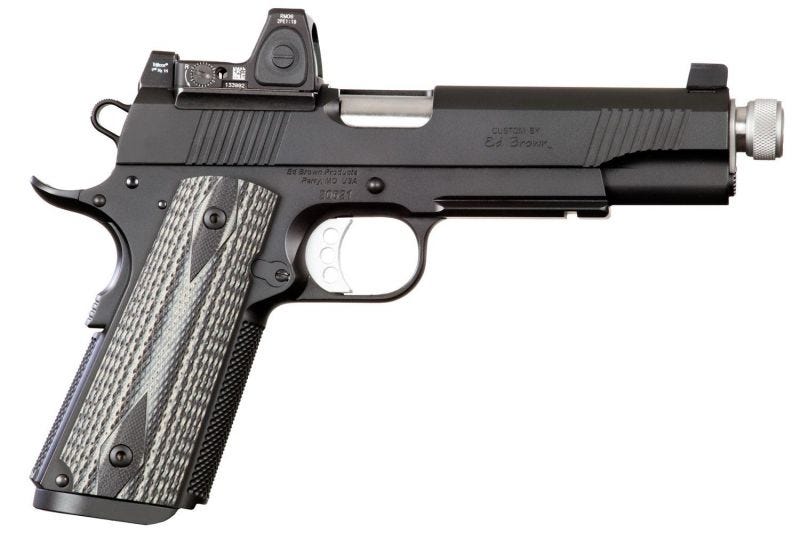 ED BROWN CUSTOM 1911 Suppressor Ready Ed Brown SF3SSG4LRSR Special Forces Suppressor Ready SOA 45 Automatic Colt Pistol (ACP) 5.0″ 7 1 Blk/Gray G10 Grip Blk Gen4 Ready for use with a suppressor, a threaded barrel is standard on this model. The slide features front and rear cocking serrations and is complete with a Trijicon RMR sight, which is the most rugged miniature red dot sight available, and has the versatility to be used in any lighting condition. Trijicon tall iron night sights complete the sight set up, providing the perfect backup sight system. A unique and highly durable Chainlink III pattern provides a secure grip for severe applications. Whether you’re shooting for pleasure, or for tactical use, the Special Forces SR has everything you need for serious performance in a dedicated suppressor 1911 pistol. SPECIFICATIONS: Mfg Item Num: SF3SSG4LRSR Category: PISTOLS Type :Pistol Action :Single Caliber :45 Automatic Colt Pistol (ACP) Barrel Length :5.0″ Capacity :7 1 Safety :Manual Grips :Black/Gray G10 Sights :Trijicon RMR Weight :40 oz Frame Finish :Black Gen4 Frame Material :Steel Barrel Type :Threaded Slide Description :Black Gen4 Case Type : Barrel Length Range :5.00″ to 5.99″ Weight Range :32.00 oz to 47.99 oz