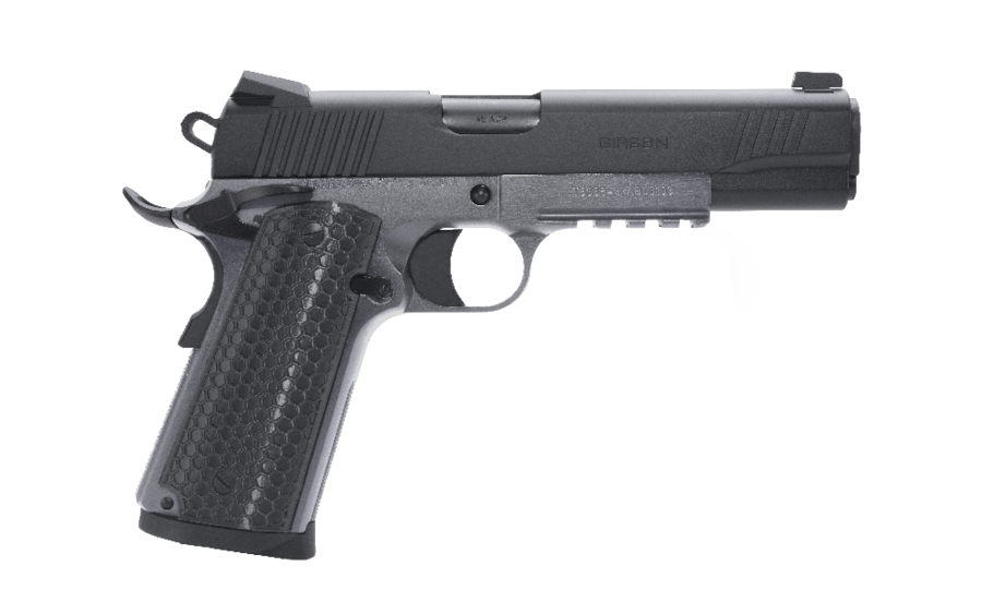 The Untouchable series of the MC1911 offers a premium classic-style tactical 1911 pistol at an affordable price that is ideal for target shooting or defensive use. The pistol features hexagon-texture grips with a 7-pattern slide serration cut and 3-dot iron sights. An ambidextrous safety lever allows for easy use by both right and left-handed shooters. This model is the S variant and features a two-tone gray and black finish pattern and a 5-inch barrel. It is chambered in .45 ACP and includes one 8-round magazine.