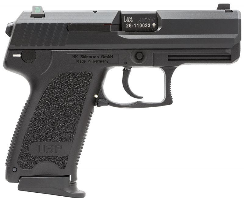 USP40 Compact V7 LEM Features Based on the full size USP, HK’s USP40C combines compact size with optimum effective shooting performance. The reduction in trigger reach and grip circumference increases concealability and enhances shooting ergonomics. The USP Compact uses a narrow, full hand grip frame with open mounting grooves allowing for the addition of a variety of accessories. It has an ambidextrous magazine release and an extractor which doubles as a loaded chamber indicator. the USP Compact is built to take the punishment of high-energy +P loads. This model is a Variant 7 LEM double action only with no manual safety/decocking lever. It comes with three (3) magazines and night sights. USP40 Compact V7 LEM Specifications Caliber: 40 S&W Model: USP40C Series: Compact V7 LEM Frame Finish: Black Action: DAO Barrel Length Range: 3″ to 3.99″ Slide Description: Blued Capacity: 12+1 Frame Material: Polymer Grips: Black Polymer Hand: Right Includes: 3 Magazines OAL: 6.81″ Safety: No Manual Sight Configuration: Night Sight Style: Night Weight: 27.50 oz Barrel Description: Polygonal Rifling Barrel Length: 3.58″