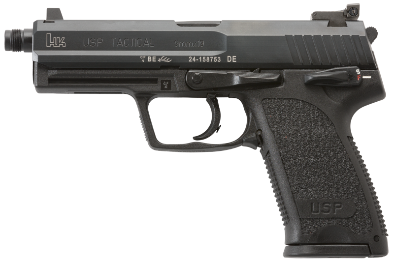 USP9 Tactical V1 Features Enhanced versions of the USP, the USP Tactical models are designed for users who need the features found on the HK Mark 23, but in a more compact pistol. Both pistols approach the precision found on the Mark 23 by adding an extended threaded barrel with a rubber O-ring, adjustable trigger, and adjustable target-type sights. The .45 ACP model of the USP Tactical is constructed on the USP45 frame. The 9 mm and .40 S&W Tactical models are built on the USP 9mm/40 caliber frame. The 9 mm variant, known as the USP9 SD, has a slightly different set of features. 9mm does not included o-ring barrel, match trigger, and adjustable trigger stop. This firearm includes two 15rd magazines. USP9 Tactical V1 Specifications Caliber: 9mm Luger Model: USP9T Series: Tac Frame Finish: Black Action: Double Action Only Barrel Length Range: 4″ to 4.99″ Slide Description: Black Capacity: 15+1 Frame Material: Polymer Grips: Black Polymer Hand: Right Includes: 2 Magazines Overall Length: 7.94″ Safety: Ambidextrous Sight Configuration: Adjustable Target Sight Style: Adjustable Weight: 27.20 oz Barrel Description: Polygonal Rifling Barrel Length: 4.86″