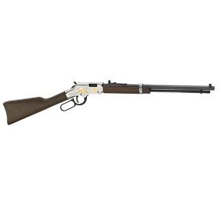 Action: Lever Action Rifle Caliber: .22 S/L/LR Capacity: 16 LR/ 21 S Weight: 6.75 lbs. Overall Length: 38.5″ Receiver Material: Alloy Barrel Type: Octagon Blued Steel Barrel Length: 20″ Twist Rate: 1 in 16 Stock Material: American Walnut Length of Pull: 14″ Rear Sight: Semi-Buckhorn Front Sight: Brass Bead Embellishments/Extras: Receiver engraving with 24K gold plating. Gold Eagle, 2nd Amendment, scroll, cold dead hands