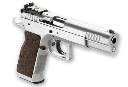 Limited Pro Features The Defiant Limited Pro double/single action pistol is designed specifically to meet the requirements of the I.P.S.C Production Class. This model features hard chromed finishing, squared trigger guard, checkering on the front and back of the frame for increased grip, polygonal rifle, and larger slide serrations. Standard on the Limited Pro are the Custom Safety, Custom Magazine Release that is user reversible, walnut checkered grips, fully adjustable rear Supersight, and interchangeable front sight. Limited Pro Specifications Caliber: 9mm Luger Model: Limited Pro Frame Finish: Hard Chrome Action: SA / DA Barrel Length Range: 4″ to 4.99″ Slide Description: Hard Chrome Capacity: 16+1 Frame Material: Steel Grips: Brown Polymer Hand: Right OAL: 8.70″ Safety: Ambidextrous Extended Thumb Sight Configuration: Interchangeable Front, Adjustable Rear SuperSight Sight Style: Contrast Weight: 42 oz Barrel Description: Polygonal Rifling Barrel Length: 4.80″
