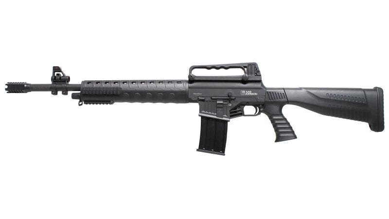 Stryker Features Iver Johnson Arms Stryker is an AR15 style semi-automatic shotgun which features a smooth bore barrel with muzzle break. It utilizes a synthetic forend with rails on the sides and bottom, 2-piece pistol grip stock with push button releases, standard AR15 bolt release and mag release. The Stryker also has an A2 style detachable carry handle with adjustable sight, fiber optic front sight, cross trigger safety, and thick rubber buttpad. It includes two 5-round box magazines. Stryker Specifications Model: Stryker Gauge: 12 Gauge Stock Finish: Black Action: Semi-Auto Barrel Length Range: 20″ to 21.99″ Sights: Adjustable Rear, Fiber Optic Front Capacity: 5+1 Chamber: 3″ Muzzle: Muzzle Brake Hand: Right OAL: 33.75″-43″ Receiver Finish: Black Recoil Pad Type: Rubber Safety: Crossbolt / Trigger Stock Finish Group: Black Stock Material: Synthetic Weight: 7.10 lbs Barrel Finish: Black Barrel Length: 20″