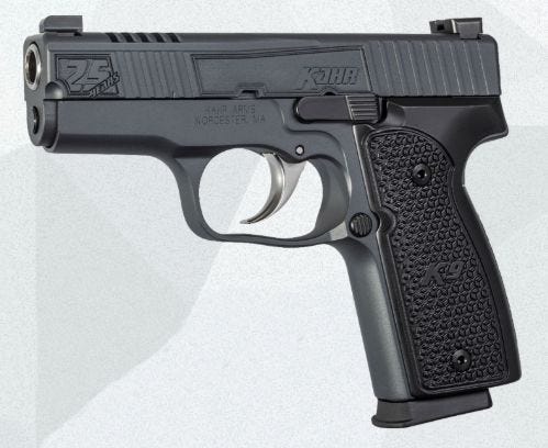 Kahr 25th Anniversary K9 9mm 3.5″ Barrel 7-Rounds Night Sights Features: The Kahr Arms K9 is an ideal choice for concealed carry permit holders looking for maximum stopping power and ultra concealment with all the features of a tactical pistol. Like all Kahr handguns, it’s an excellent American Made Pistol that is reliable, durable, and accurate. If you are looking for the ultimate in concealed carry, the Kahr Arms K9 may be the EDC pistol you have been searching for. In honor of Kahr’s 25th Anniversary this is a Limited Edition K9. If features a custom engraved 25 Year ported slide with Hogue stippled aluminum grips and a sniper gray Cerakote finish. This pistol looks like a collector’s piece, but with tritium night sights, this is still a defensive pistol that is meant for daily carry. Only 500 of these unique pistols are being made, and they are each engraved with a Limited Edition Number. (Sorry, but no choice or handpicking of numbers.) It includes a 25 Year custom belt slide holster from 1791 Gunleather. This is a great look with fantastic performance in a proven self defense pistol. Get your Kahr K9 25th Anniversary pistol today, because by tomorrow they’ll be gone. Kahr 25th Anniversary K9 9mm 3.5″ Barrel 7-Rounds Night Sights Specifications: Kahr Item Number: K9094N Limited Edition Compact Semi Automatic Pistol Double Action Only 9mm Luger 7 Rounds 3.5″ Barrel with a 1:10 Twist 25 Year Engraved Logo and Ported Slide Engraved Limited Edition Number Tritium Night Sights Steel Frame Hogue Stippled Aluminum Grips Sniper Gray Cerakote Finish Overall Length 6″ Weight 23.1 oz Made In The USA!