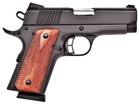 HOWA/LEGACY SPORTS INT Compact Range Kit Citadel CIT45CSPRK2 M1911 Single 45 ACP 3.5″ 6 1/7 1 Wood Grip Blk w/Range Bag Citadel’s M-1911 features Series 70 Firing System, cast steel frame and forged steel slide, skeletonized hammer and trigger, Novak style sights, lower and flared ejection ports, positive extended beavertail grip safety and 1911 round trigger guard. This compact model has a 3.5″ barrel and is supplied with two 7-round magazines and two 6-round magazines. It comes with a range bag which features padded PWWocket for handgun, three magazine pouches, eye protection pouch, earplug pouch, and embroidered Citadel logo. SPECIFICATIONS: Mfg Item Num: CIT45CSPRK2 Category: PISTOLS Type :Pistol Action :Single Caliber :45 Automatic Colt Pistol (ACP) Barrel Length :3.5″ Capacity :6 1/7 1 Safety :Beavertail Grips :Wood Sights :Novak Weight :33.6 oz Frame Finish :Black Frame Material :Steel Barrel Type :Bushingless Slide Description :Black Case Type :Soft Nylon