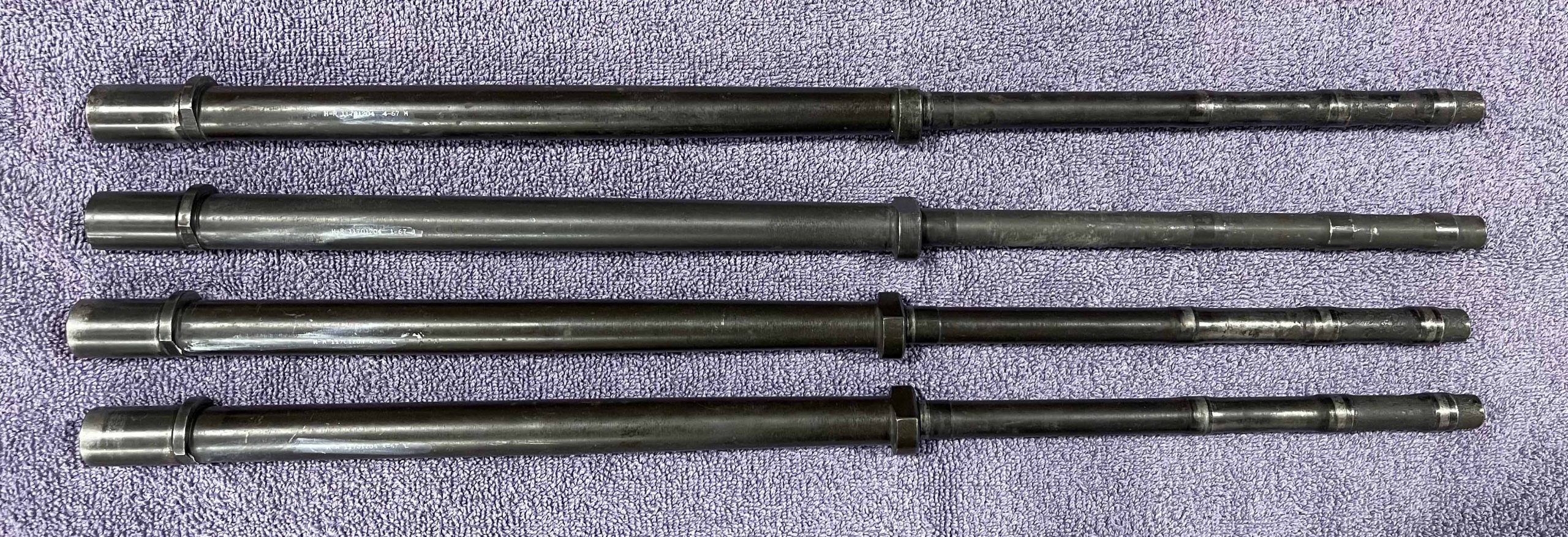 Four 7.62×51 Mini-gun barrels from 1967, in the middle of the Viet Nam war.� These barrels are used but very serviceable.� Carbon buildup on muzzles visible in one photo.� Using an M-8 Barrel Erosion Gage, (see instruction photo), the bores gauged from 75% to 90% serviceable.� Two barrels have slightly detectable bulges about 6 inches from the beginning of the bore.� The condition of each barrel, using its identification information visible in one of the photos, is as follows.� These are �best estimates� of the condition of the barrel rifling in each barrel: