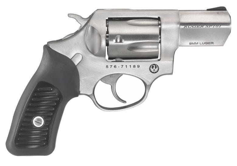 Ruger SP101 9MM Features Cushioned rubber grip with black plastic insert has no exposed metal in the backstrap, making it extremely comfortable. Takedown of integrated subassemblies requires no special tools and allows for easy maintenance and assembly. Patented transfer bar mechanism provides an unparalleled measure of security against accidental discharge. Patented grip frame easily accommodates a variety of custom grips. Triple-locking cylinder is locked into the frame at the front, rear and bottom for more positive alignment and dependable operation shot after shot. Cushioned rubber grip with black synthetic insert has no exposed metal in the backstrap, making it extremely comfortable. Takedown of integrated subassemblies requires no special tools, allowing for easy maintenance and re-assembly. Transfer bar mechanism provides an unparalleled measure of security against accidental discharge. Grip frame easily accommodates a variety of custom grips. Triple-locking cylinder is locked into the frame at the front, rear and bottom for more positive alignment and dependable operation shot after shot. Ruger SP101 9MM Specifications Family: SP101 Series Model: SP101 Type: Revolver Action: Double / Single Action Finish: Satin Stainless Frame: Steel Frame Grips: Black Rubber Weight: 25 oz. Caliber: 9mm Capacity: 5 Barrel: 2.25″ Overall Length: 7.20″ Rate-of-twist: 1-in-16 Sights: Fixed Safety: Transfer Bar Additional Information: Exposed Hammer, Black Plastic Grip Insert, Requires Moon Clips Gun Case: Plastic