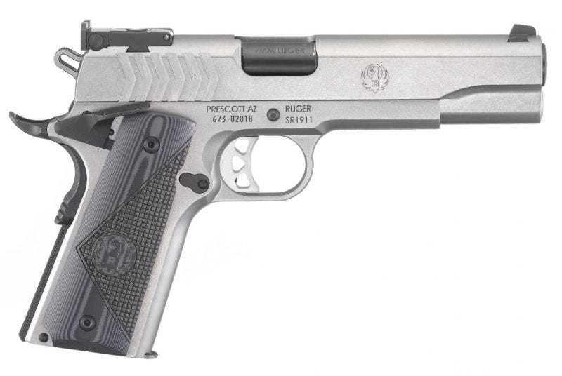 FAMILY:1911 Style Pistol Series MODEL:SR1911 TYPE:Semi-Auto Pistol ACTION:Single Action FINISH:Stainless STOCK/FRAME:Steel Frame STOCK/GRIPS:G-10 Deluxe Checkered WEIGHT:41.9 oz. CALIBER/GAUGE:9mm CAPACITY:9 1 BARREL:5″ OVERALL LENGTH:8.67″ SIGHTS:Bomar Style Fully Adjustable SAFETY:Extended Thumb Safety ADDL INFO:Oversized Beavertail/Grip Sfty ADDL INFO:Skeletonized Trigger & Hammer ADDL INFO:Extended Magazine Release