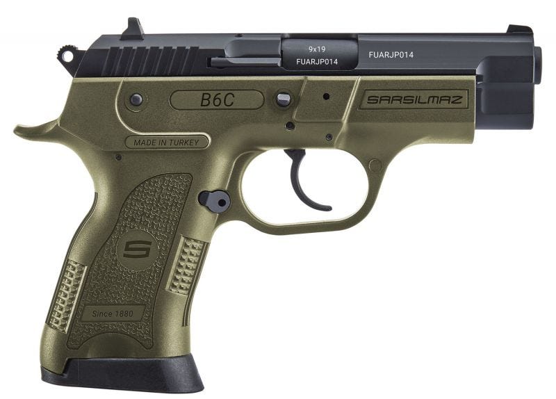 B6C Features The B6 series is the foundation of the SAR USA line of polymer frame pistols. The B6 fits any application, a longtime favorite of security and law enforcement agencies worldwide, the B6 is a no nonsense rock solid side arm of proven dependability. With an integrated hammer spur and three dot combat sights, the B6 is quick pointing and comfortable. B6C Specifications Caliber: 9mm Luger Model: B6C Frame Finish: OD Green Action: SA / DA Barrel Length Range: 3″ to 3.99″ Slide Description: Black Oxide Steel Capacity: 13+1 Frame Material: Polymer Grips: OD Green Polymer Hand: Right OAL: 7.40″ Safety: Manual Sight Configuration: 3 Dot Sight Style: Contrast Weight: 25.20 oz Barrel Type: Hammer-Forged Barrel Length: 3.80″