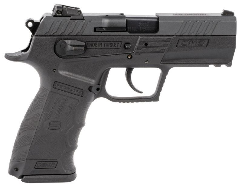 CM9 Features Sar’s CM9 is one of the smoothest shooting pistols on the market. Its ergonomic grip lets your hand feel like it is part of the pistol. The safety allows the user to carry the gun cocked and locked similar to a 1911. The adjustable 3 dot sights allow for quick target acquisition. The front slide serrations are perfect for manipulating the slide. Additional features are ambidextrous safety, left or right magazine release, 3 backstrap options to suite any shooter, and a picatinny frame rail for accessories. An awesome package in a high capacity 29 oz pistol. CM9 Specifications Caliber: 9mm Luger Model: CM9 Frame Finish: Black Action: SA / DA Barrel Length Range: 3″ to 3.99″ Slide Description: Black Steel Capacity: 10+1 Frame Material: Polymer Grips: Black Interchangeable Backstrap Hand: Right OAL: 7.30″ Safety: Ambidextrous Sight Configuration: 3 Dot Sight Style: Contrast Weight: 25.80 oz Barrel Length: 3.80″