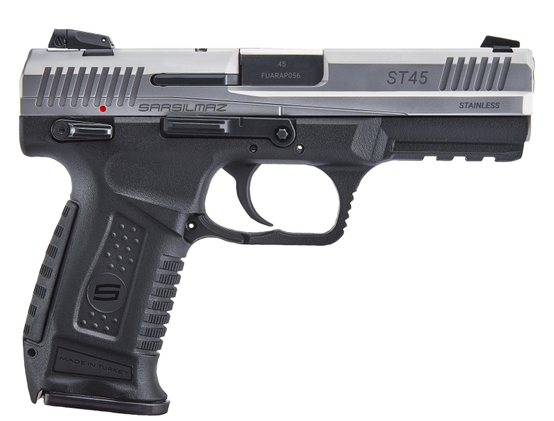 SAR ST45 Features The ST45 is a striker fire polymer frame pistol with a host of features. These features include ambidextrous magazine release, and frame safety, 3 dot adjustable low profile sights, interchangeable backstraps to customize your fit, front and rear serrations on the slide to make it easy to manipulate the slide, and picatinny frame rail to add your favorite accessories. The rear of the slide features a red flag indicator that shows when the pistol is cocked and loaded. When the trigger is pulled, the red flag disappears to show the gun is not loaded and safe. This pistol will soon become one of your favorites due to its flexibility. SAR ST45 Specifications Caliber: 45 ACP Model: ST45 Frame Finish: Black Action: Double Action Only Barrel Length Range: 4″ to 4.99″ Slide Description: Stainless Steel Capacity: 12+1 Frame Material: Polymer Grips: Black Interchangeable Backstrap Hand: Right Overall Length: 7.80″ Safety: Ambidextrous Sight Configuration: 3 Dot Sight Style: Contrast Weight: 29.60 oz Barrel Length: 4.50″