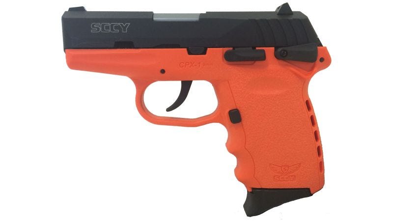 SCCY INDUSTRIES CPX-1 9MM •Version: CPX-1 (Ambidextrous Safety) •Slide Finish: Black Nitride •Grip Frame: Orange •Compact concealed carry •DAO trigger •Barrel & slide machined from 416 stainless steel bar stock •Fully encapsulated all steel spring system (including steel guide rod) •3-dot sight system (rear drift-adjustable for windage) •Zytel polymer frame w/finger grooves & recoil-absorbing backstrap •Includes trigger lock & (2) 10-round mags. w/flush & extended baseplates •SCCY Perpetual Warranty •Width: 1.1″ •OAL: 5.7″ •Wt.: 15 oz.