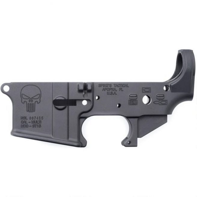 Spikes Tactical Punisher Stripped Lower Features: Want to build the ultimate modern sporting rifle for dealing with the zombie hordes? This top quality lower from Spikes Tactical is the perfect foundation for the gun you’ll depend on when the apocalypse comes. Featuring the famous Punisher logo, it is caliber marked “MULTI” and has Bullet Pictogram Selector Markings. Precision machined to precise tolerances, this lower will work with most AR-style upper assembly. Spikes Tactical Punisher Stripped Lower Specifications: Brand: Spikes Category: Stripped Lowers Caliber: Multi-Caliber Model: Stripped Lower Series: Punisher Type: Lower Receiver Finish: Black Hardcoat Anodized Material: 7075 T6 Aluminum Gun Model: AR-15 Gun Type: AR Trigger: None