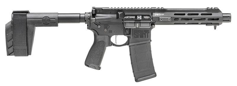 Saint Victor Pistol Features Springfield’s Saint Victor AR Pistol features forged upper and lower 7075-T6 aluminum receiver with Accu-Tite tension system and a receiver end plate with QD swivel mount point. It also has a 7.5″ 416R stainless steel barrel with Melonite treatment and a SA forward blast diverter. The handguard is free-floating with M-Lok and a forward hand stop. The Saint AR Pistol also features a SB Tactical SBX-K forearm brace, a Bravo Company MOD three pistol grip, carbine “H” heavy tungsten buffer, and a 30-round MagPul PMAG Gen 3. Saint Victor Pistol Specifications Brand: Springfield Armory Category: Tactical Pistols Caliber: 5.56 NATO Model: Saint Series: Victor Type: AR Pistol Action: Semi-Automatic Barrel Length Range: 7.00″ to 7.99″ Sights: None, Optic Ready Capacity: 30 1 Grips: Black Polymer Metal Finish: Black Hardcoat Anodized OAL: 26.5″ Receiver Material: 7075 T6 Aluminum Forged Stock Finish: Black Stock Material: Polymer Stock Type: SB Tactical SBX-K Arm Brace Twist: 1:7″ Weight: 5.8 lbs Barrel Description: 416 Stainless Steel Barrel Finish: Black Melonite Barrel Length: 7.5″