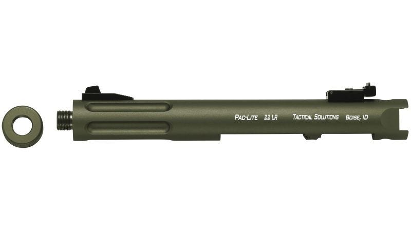 REQUIRES FFL TRANSFER TACTICAL SOLUTIONS PAC-LITE FLUTED BARREL UPGRADE •Color: Matte Olive Drab Green •Frame not included •Drilled & tapped barrel/receiver features heat treated SS ejector •Lightweight. aircraft aluminum fluted barrel features polished 11° angled target crown &1/2-28TPI threaded end •1:16″ twist •Adjustable rear sight •Anodized aluminum finish •Barrel/receiver upgrade easily replaces the factory barrel of any Ruger Mark & 22/45 Series frame without gunsmithing & utilizes the Ruger factory bolt & frame