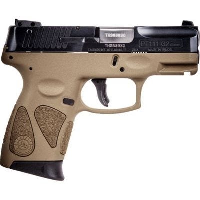 TAURUS MODEL 111 MILLENNIUM G2 •Flat Dark Earth grip frame •Matte black carbon steel slide •Hammerless SA/DA Striker Firing System •Lightweight stippled compact polymer grip frame w/integral M1913 Picatinny rail •Finger indexing Taurus Memory Pad •White 3-Dot Sight System: Fixed Front/Adjustable Rear •Safety Devices: Trigger Safety Thumb Safety Firing Pin Block Loaded-Chamber Indicator •Taurus Security System •Disassembly latch •Includes (2) mag •Width: 1.2″ •OAL: 6.2″ •Wt.: 22 oz.