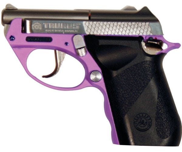 PT-22POLYMER LAVENDER FRAME – BLACK GRIPS•Cal. .22 LR •Cap.: 8 •Brl.: 2-3/4” •Finish: SS •DAO •Small frame, semi auto •Smooth trigger pull • Steel/alloy construction •Fixed sights •Manual safety •Snag-free hammer •Trigger guard-mounted magazine release •Tip-up barrel •Magazine disconnect •Extended mag base •Taurus Security System® •Unlimited Lifetime Repair Policy™ •Wt.: 13 oz.