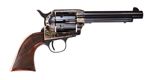 Exclusively from Taylor’s & Co., The Smoke Wagon is a second-generation, stagecoach-style, single-action revolver. It boasts a low-profile hammer and wider-style sights that allow for faster sight acquisition without cocking the pistol. It also features a blue finish with a case-hardened frame, and a thin, richly detailed, checkered grip for comfort and improved aim. All of the previous features are available on both the standard and deluxe version of The Smoke Wagon. The deluxe edition model also includes custom tuning; custom hammer and base pin springs; trigger pull set at three pounds; jig-cut, positive angles on all triggers and sears for crisp, reliable action; a coil-loaded hand; and wire bolt. The Smoke Wagon Deluxe features one of the smoothest hammer and trigger pulls on the market. Specifications: – Barrel Length: 5-1/2 Inch – Caliber: .357 Mag. – Capacity: 6 Rounds – Weight: 2.30 lbs. – Finish: Blue Finish with Case Hardened Frame – Grip/Stock: Checkered Walnut – Sights: Widened Sight Channel; Widened Front Blade – Overall Length: 11 Inches – Version: Standard Edition