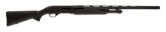 Rugged reliability with a non-glare matte finish on the barrel and receiver that won’t cause birds to flare. The durable composite stock and forearm are up to tough conditions. The hard working SXP action fires all factory 2 3/4″, 3″ and 3 1/2″ steel, tungsten, bismuth and lead loads through a chrome plated .742″Back-Boredbarrel with Invector-Plus™ chokes, ensuring optimum patterns. Choose a tough 12 gauge 3″ or 3 1/2″ chamber in either a 26″ or 28″ barrel. Pick up the new Winchester SXP shotgun and experience the light weight, centered balance and instant pointability firsthand. The Super X design provides you with the fastest follow-up shots. No other pump offers the feeling of an inertia-assisted slide-action that can deliver three shots in a half second. THE WORLD’S FASTEST PUMP ACTION. Whether its super-speed clays or fast-flushing upland game, keep up with shooting’s fastest action with the Super X Pump, the perfect choice for pump shotgun lovers. Because of its inertia-assisted slide-action, it’s the fastest in the world for follow-up shots. Three shots can be delivered in just a half second. Cycle one through and see if it’s not the finest fitting, sweetest handling and fastest pump out there. ROTARY BOLT Four massive lugs provide support, strength and solid lockup in the receiver of the lightning-fast Super X Pump. Under recoil the mass of your body begins to slow the rearward travel of the shotgun, while the inertia of the bolt, slide and forearm continue cycling the action to help you get a head start on your next shot. Dual steel action guide bars channel and eliminate twisting, binding, wasted time and energy when cycling the action. BLACK CHROME PROTECTION Better than conventional bluing, black chrome finishes stand up to years of wear and last longer. Parts and surfaces are easier to clean and stay cleaner. INFLEX RECOIL PAD Recoil absorption is critical on any shotgun, and the new Super X Pump has the best pad made. Rib structures inside the pad help direct and channel the recoil impulse, moving the comb down and away from your cheek. A hard heel insert on the pad makes mounting the Super X Pump snag free. .742″Back-BoredTECHNOLOGY Extensive research and testing has proven that when it comes to back-boring, .742″ is the ideal 12 gauge interior barrel diameter, ensuring tight, consistent patterns. Any larger and gases blow by the shot cup and reduce pellet velocity. Too small and the pellets are deformed as they pass through the forcing cone, causing poor ballistic performance. DROP-OUT TRIGGER GROUP Removing one pin allows you to drop out the complete trigger system for cleaning and inspection. Nothing could be simpler in keeping your Super X Pump in excellent working condition. HARD CHROME CHAMBER AND BORE A chrome chamber and bore are optimum features when using steel or tungsten shot. This makes the surfaces impervious to wear and gives you superior protection from rust and corrosion. All Super X Pump shotguns feature a hard-chromed bore and chamber. INVECTOR-PLUS™ CHOKE TUBES From the duck blind to the firing line, the Invector-Plus choke tube system is the world’s favorite. Most Field model Super X Pump versions come with full, modified and improved cylinder flush-mounted tubes so your gun is ready to shoot right out of the box. Turkey models come with a single X-Full Turkey choke tube. Be sure to check the listed specificatons for the chokes provided with other models. SPEED-PLUG SYSTEM When removing the three-shot adapter, simply remove the magazine cap, push on the spring retainer holding the spring in place and remove the adapter. It’s trouble-free and in seconds you can remove or install the adapter. CROSSBOLT SAFETY The crossbolt safety button on the Super X Pump is located on the front of the trigger guard for easy access, even when wearing gloves. FAMILIAR DIMENSIONS The Super X Pump composite stock provides you with the same familiar feel of the Super X3. Pistol grip radius, trigger reach, comb height and length of pull are all patterned after the fastest autoloader in the world. The stock bolt passes through the wrist of the stock and attaches solidly into the back of the alloy receiver.